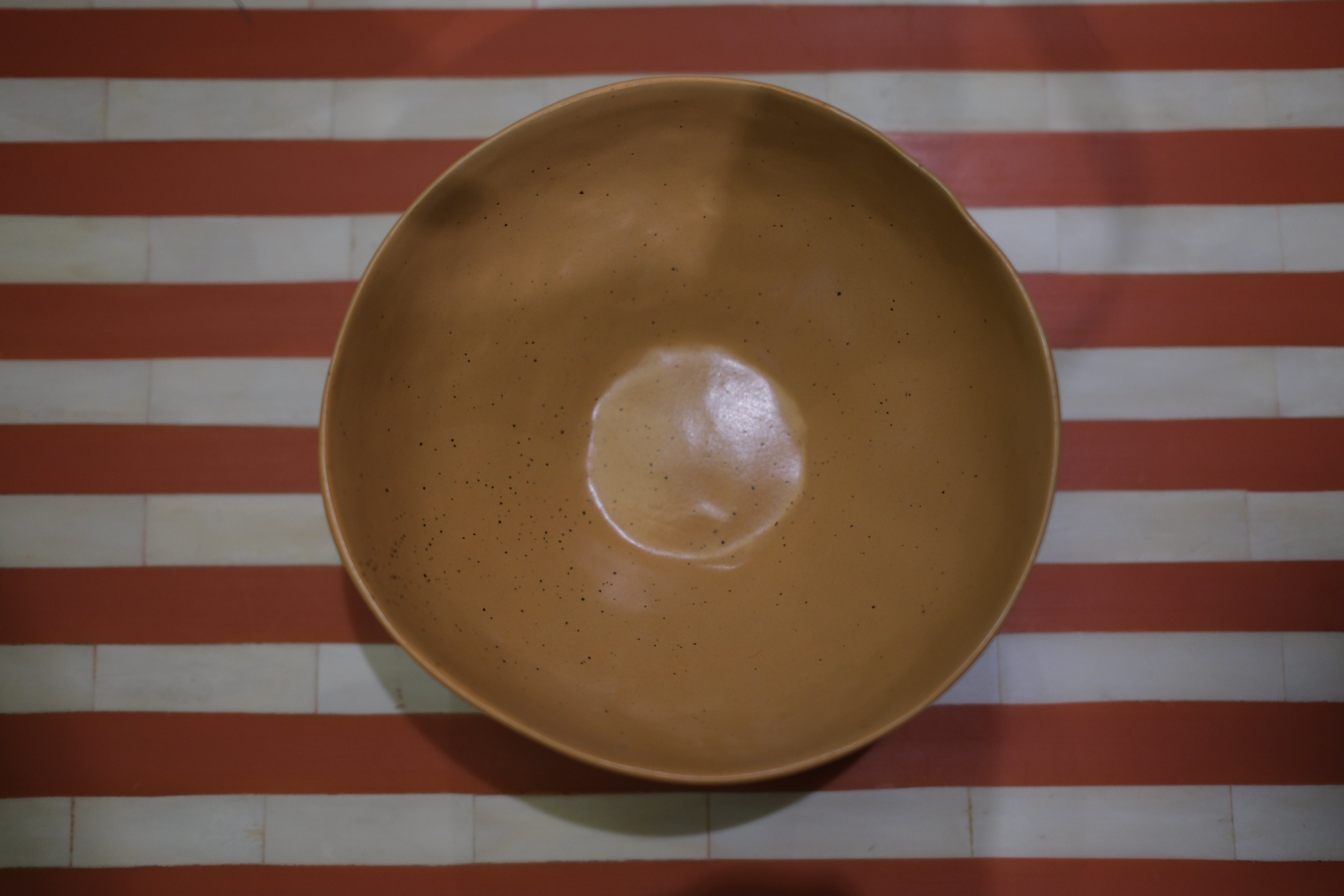 Questa ciotola in ceramica presenta una calda tonalità ocra, esaltata da piccole puntinature scure che donano profondità e un carattere artigianale al pezzo. La superficie leggermente irregolare e le sfumature più chiare al centro creano un effetto naturale e materico, rendendola perfetta sia per l’uso quotidiano sia come elemento decorativo.