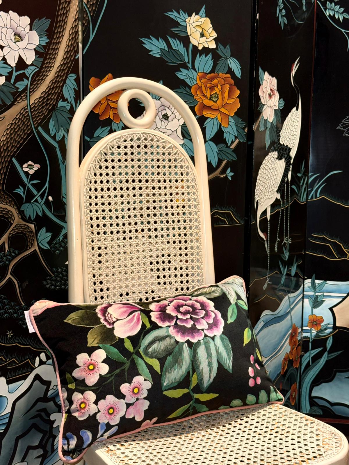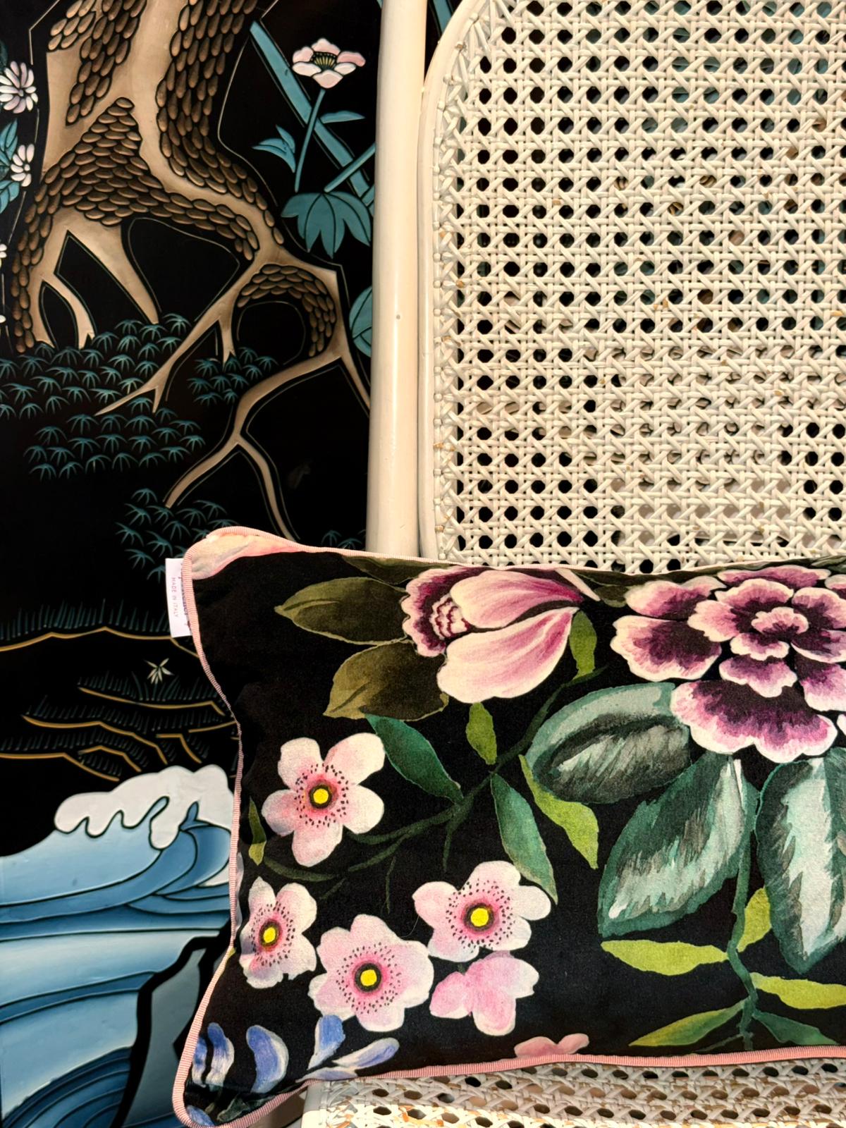 Questo cuscino in velluto dona un tocco romantico e sofisticato a qualsiasi ambiente grazie al suo ricco motivo floreale. Il fondo nero esalta la grande peonia rosa al centro e i piccoli fiori circostanti, creando un contrasto vibrante e scenografico. Le foglie dipinte in toni naturali completano la composizione, mentre il profilo rosa in tessuto aggiunge una rifinitura delicata e armoniosa.