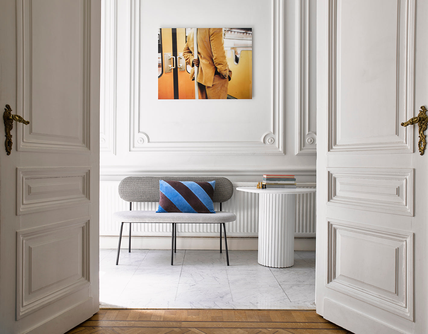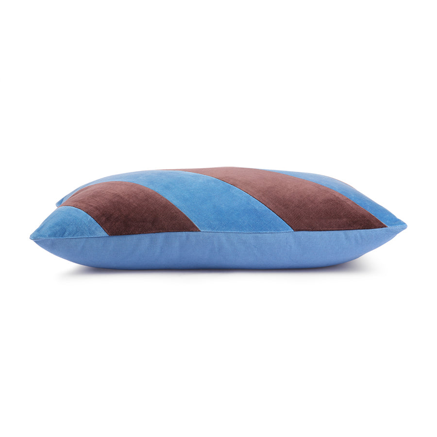 Cuscino 40 x 60 cm, completo d'imbottitura, in velluto con motivo stripes blue & brown con retro in cotone tinta unita.