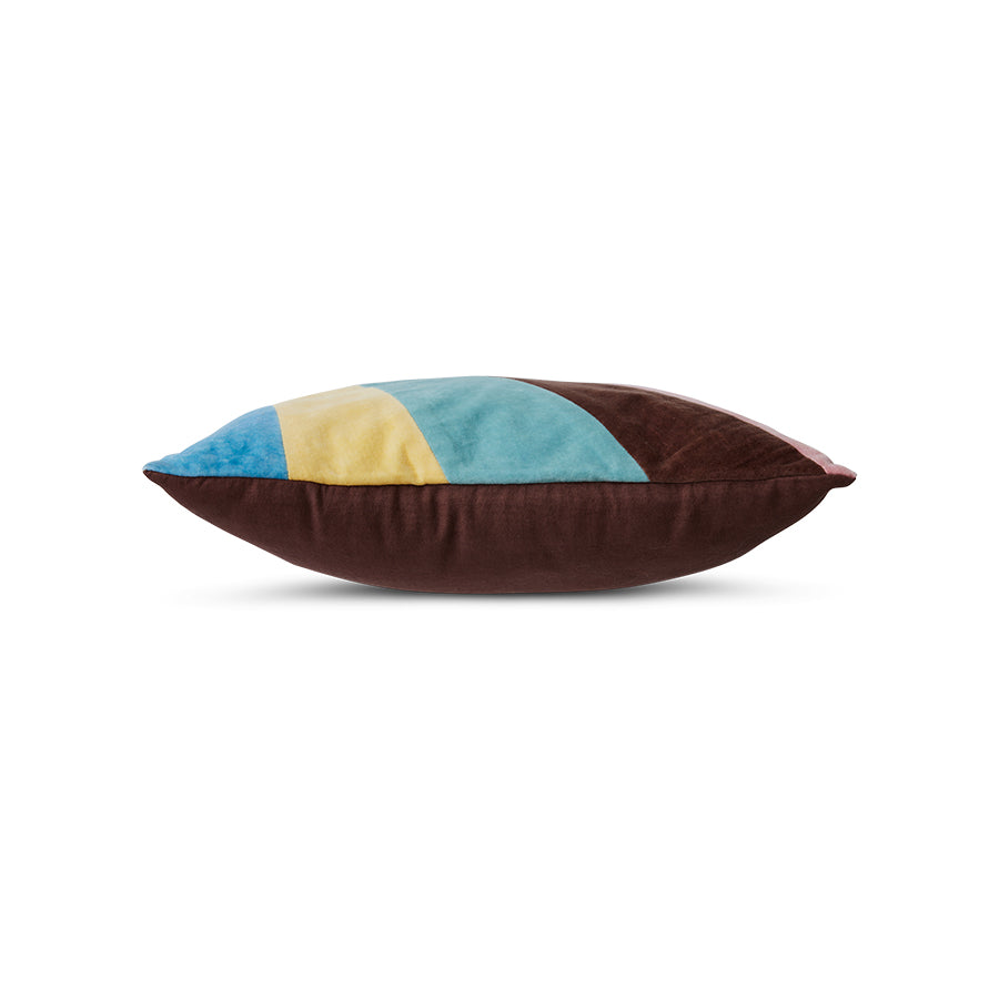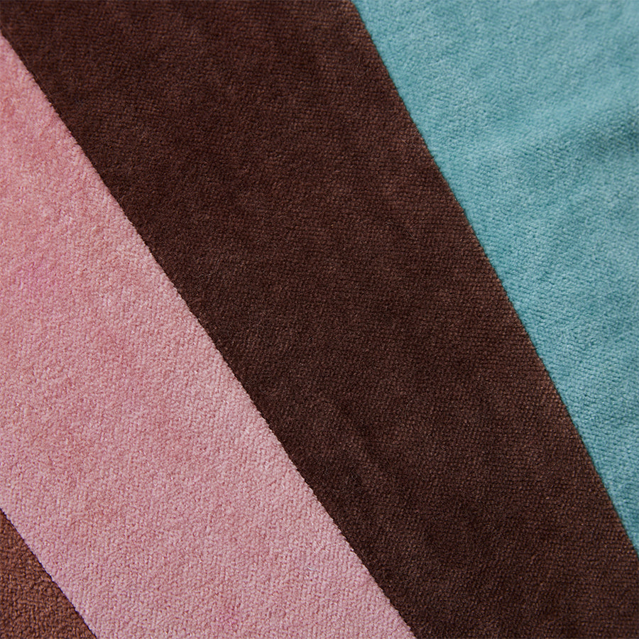 Questo cuscino in velluto dalla fantasia “Sunny Stripes” porta colore ed energia in qualsiasi ambiente grazie alle sue fasce diagonali in tonalità vivaci: azzurro, rosa, giallo, blu e marrone si alternano in un gioco di contrasti morbidi e luminosi. La superficie in velluto esalta la profondità dei colori, rendendo il cuscino un vero elemento decorativo di carattere.