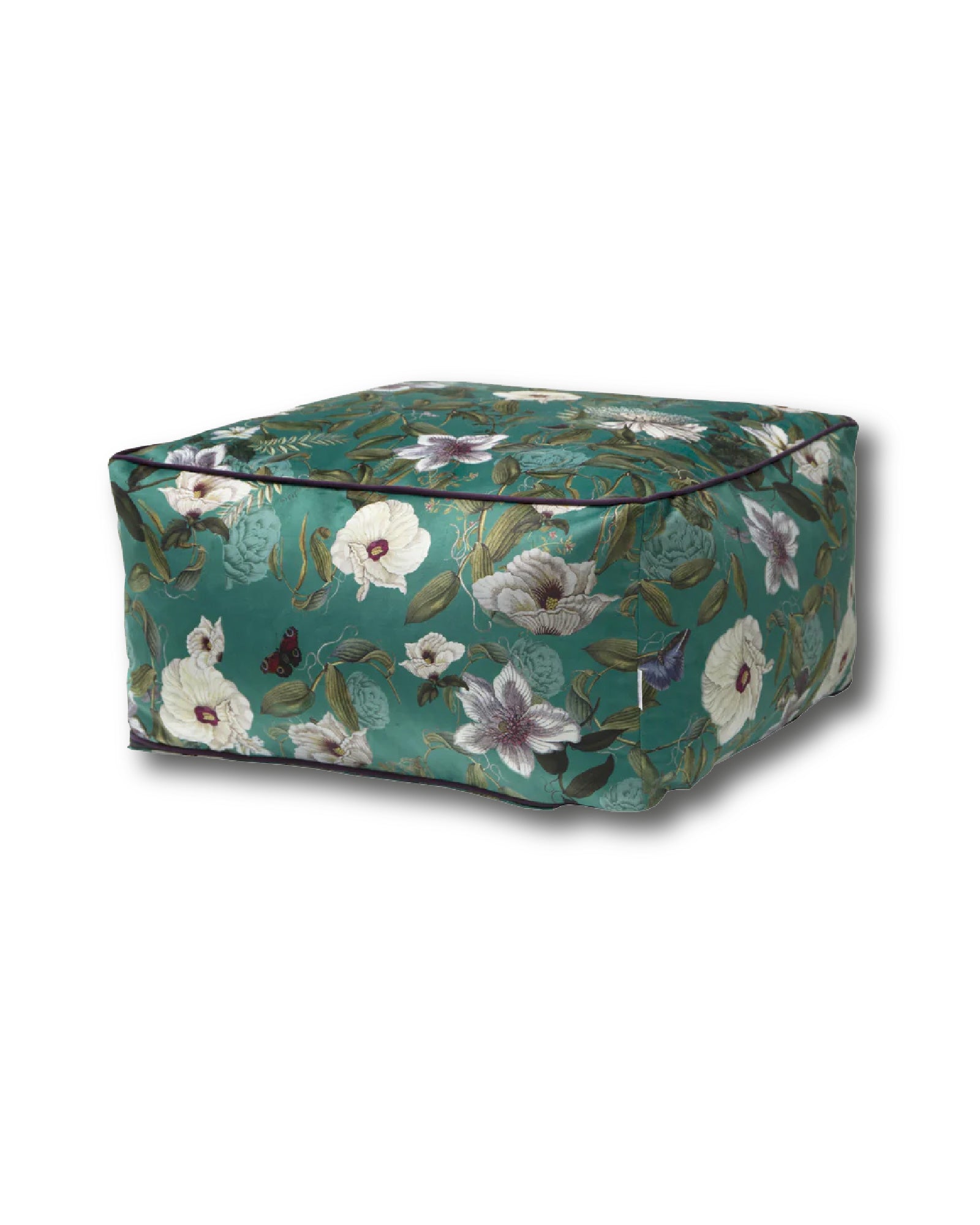 Rectangular pouf in velvet printed with Garden motif designed by Darling Mind Studio. Versatile and suitable for both living and sleeping areas.