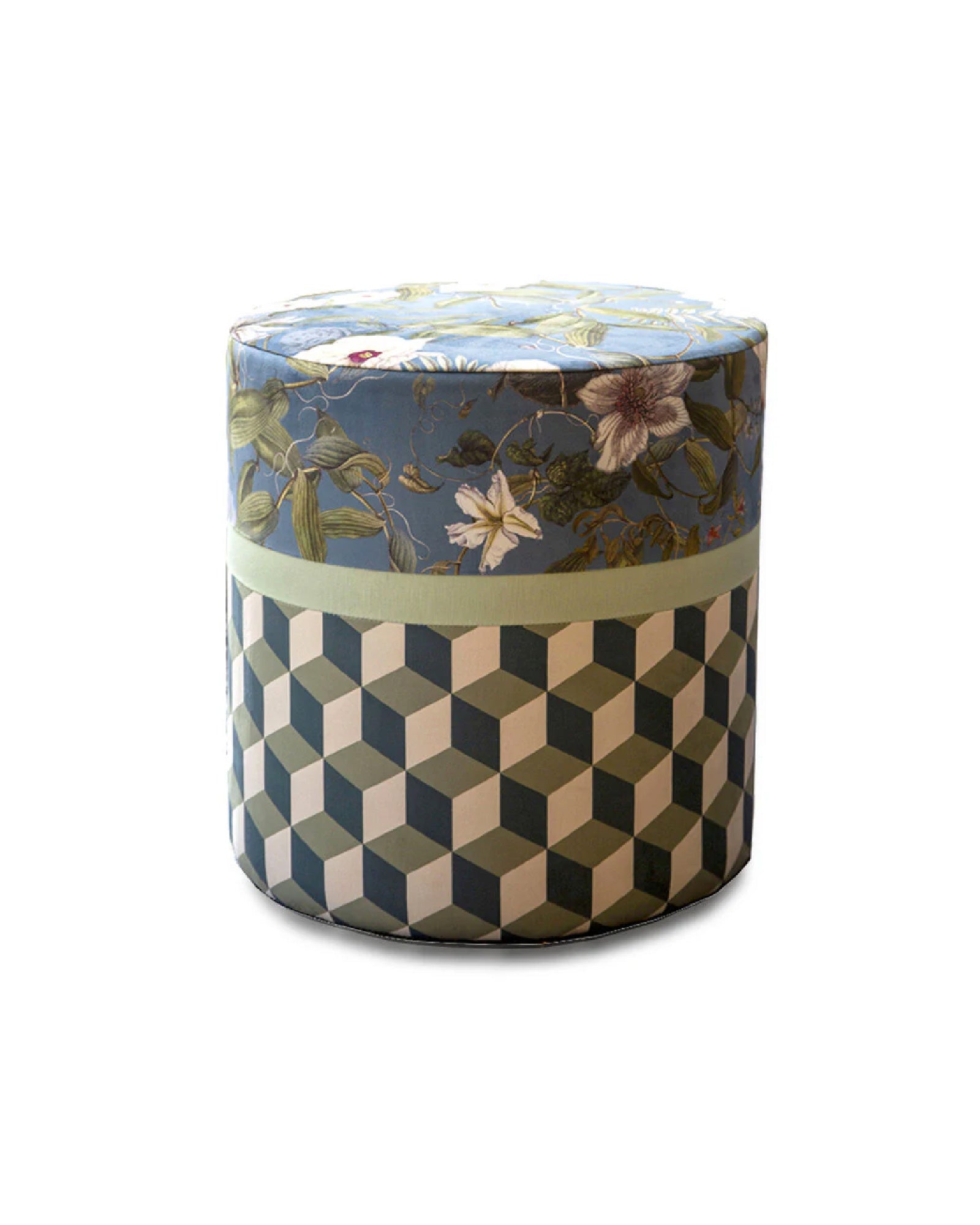 Round pouf in velvet printed with Garden motif designed by Darling Mind Studio. Versatile and suitable for both living and sleeping areas.