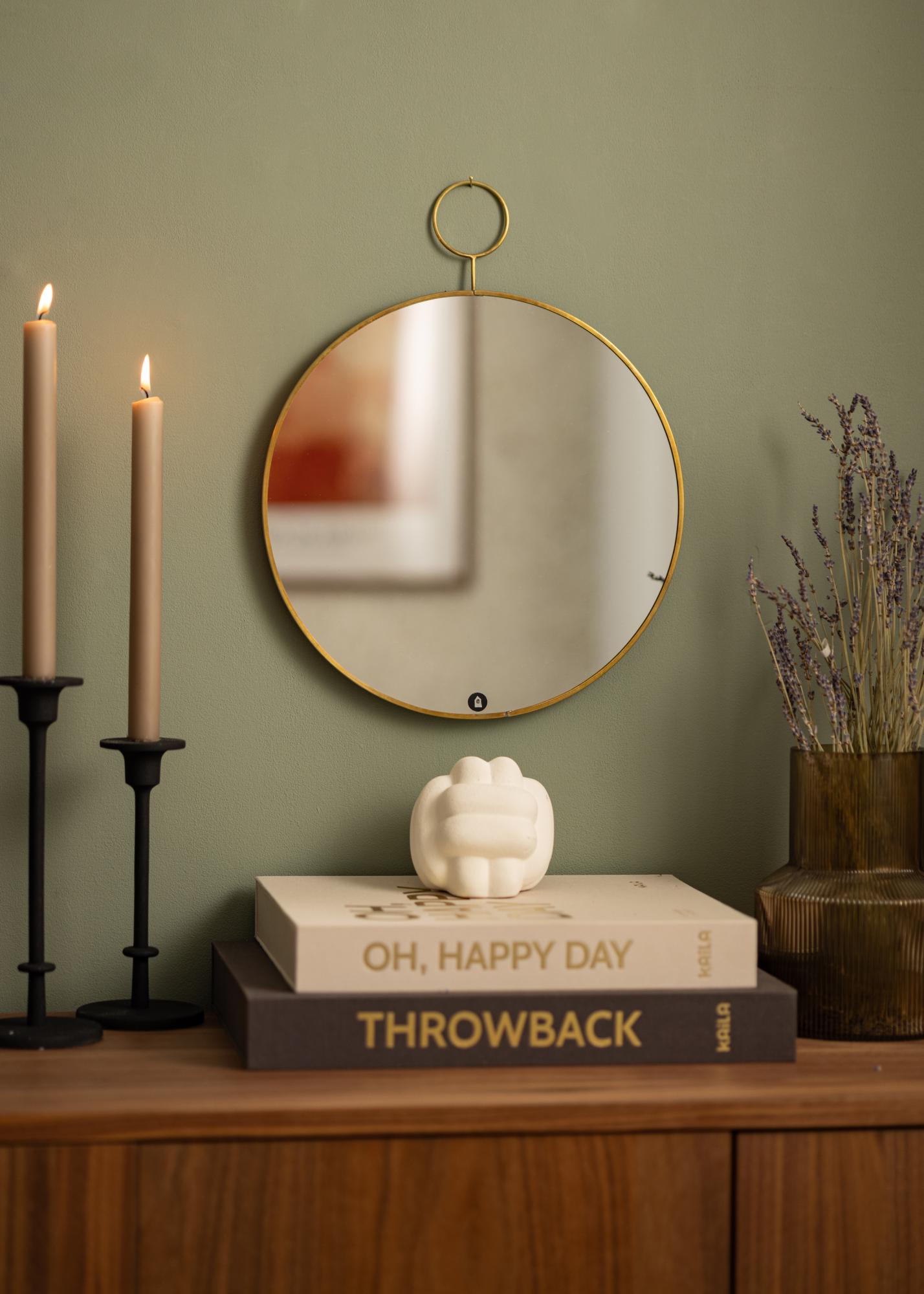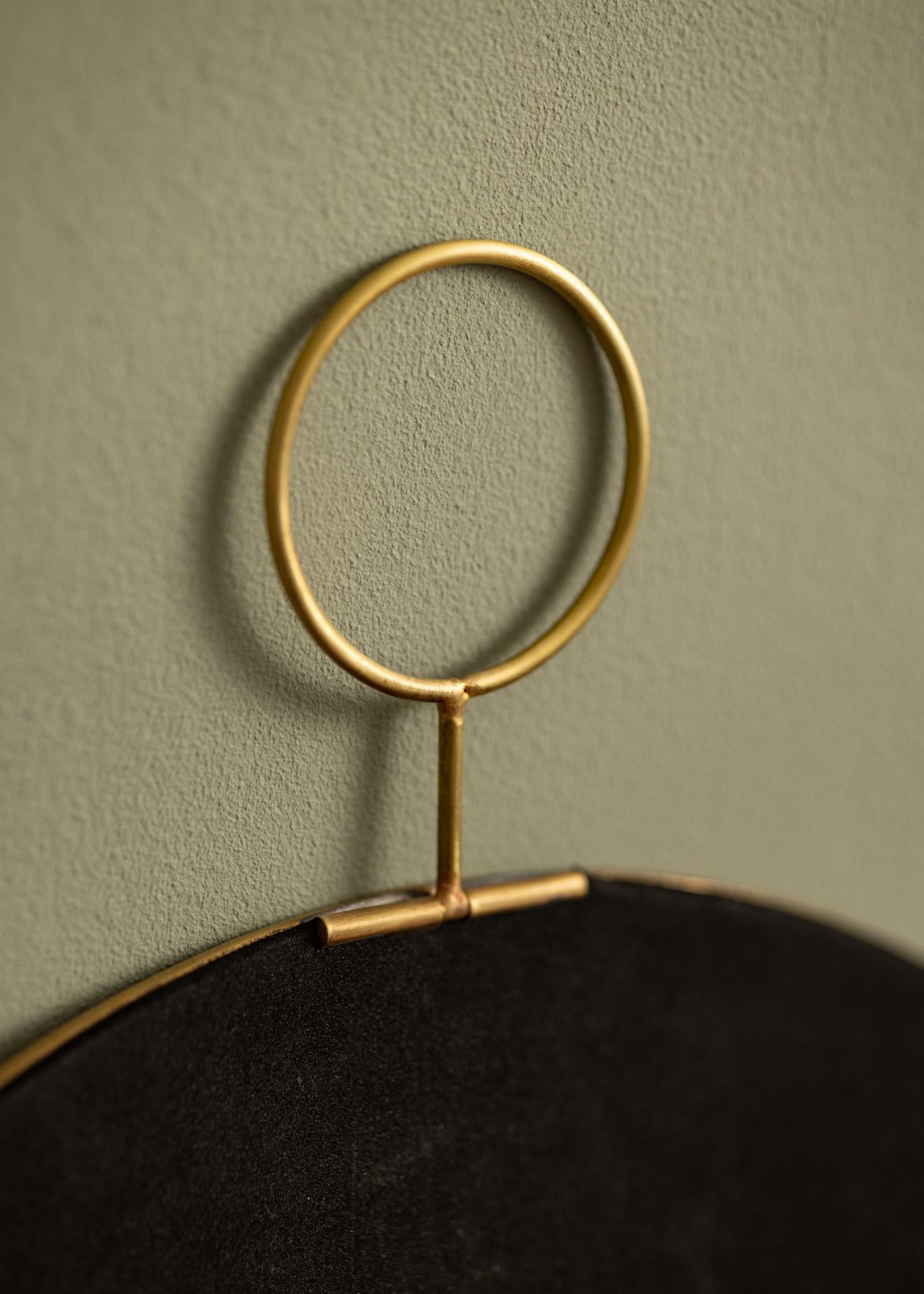 Specchio rotondo dal design essenziale e raffinato, caratterizzato da una sottile cornice in ottone e un pratico anello superiore che ne facilita l’appensione. La superficie riflettente ampia e pulita dona luminosità agli ambienti, mentre la silhouette minimalista lo rende ideale per ingressi, camere e zone living. Un dettaglio decorativo discreto ma di grande eleganza, capace di valorizzare qualsiasi parete.